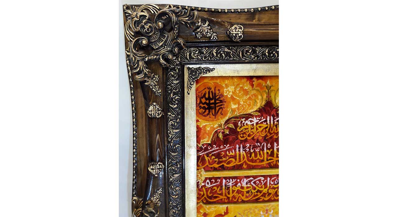 خانهتابلوفرش دستبافت تابلو فرش گل ابریشم طرح و ان یکاد و‌ سوره اخلاص کد 07